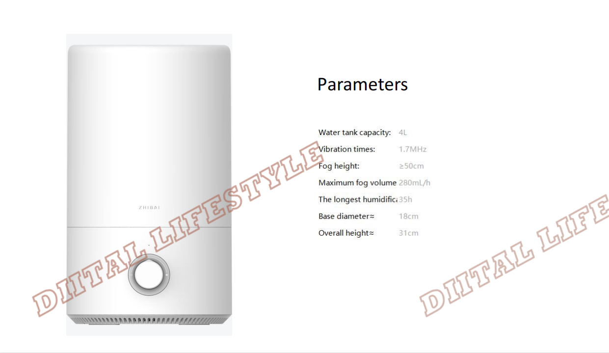 Main Features:Add water from above, easierSay goodbye to the traditional way of adding water from below, Mijia humidifier can add water directly from above. The separate design of the water tank makes adding water and cleaning more convenient.Sufficient amount of heavy fog, moisturizing all dayThe 4L large-capacity water tank is equivalent to 16 bottles of 250mL mineral water. 280mL/h strong fog volume, 10 square meters bedroom can humidify at least 9% in one hour, and relieve dryness faster. The longest humidification time can be up to 36 hours, and there is no need to add water frequently.Silver ion antibacterial material, humidification water source does not polluteThe main components of the water tank and the wading base use silver ion materials, which can effectively inhibit the growth of E. coli and Staphylococcus aureus, and the antibacterial rate can reach 99%.Light tone humidification, moisturizing does not disturbThe Mijia humidifier reduces the sound of large particles of water mist flowing and reduces fan noise, and the working sound does not exceed 38dB. The indicator light is soft and without halo, and it is not dazzling in the dark. Low noise, good sleep, comfortable sleep and moisturizing all night.Refuse to wet the table, the humidity is only in the airThe high-frequency ultrasonic atomizer vibrates 1.7 million times per second at high speed to break up water particles. The built-in baffle blocks the large particles of water, leaving only the fine water mist directly into the air through the oblique straight air duct, and the water mist is ≥50cm from the table.Large diameter designThe upper mouth of the Mijia humidifier has a diameter of 14cm, and the open mouth is easy to scrub. The sleek and delicate internal structure reduces the dead spots that hide dirt. The water tank is light and easy to lift, making cleaning more labor-saving.Double protection systemAfter the water tank is lifted, humidification is stopped. When the water source is exhausted, the machine does not dry and the orange indicator light reminds the lack of water. Double protection makes humidification safer.Stepless adjustment of the amount of fog, choose as you likeLow fog volume | Middle fog volume | High fog volumeSmall, it can be placed anywhereSmall space water storage boxReduce water storage, reduce bacteria breeding environment, humidify safe and cleanWaterproof membrane grooveBalance the air pressure of the water tank to prevent the machine from stopping workingUltrasonic welding technologyImprove product tightness and reduce the possibility of bacterial survivalSemi-closed air inlet gridReduce the possibility of internal moisture and extend product lifeNote:CN power charger charging, delivery needs to match the corresponding country adapterParameters:Rated voltage: 220V, 50HzRated power: 17.5WNoise: ≤38dBCaliber: 14cm