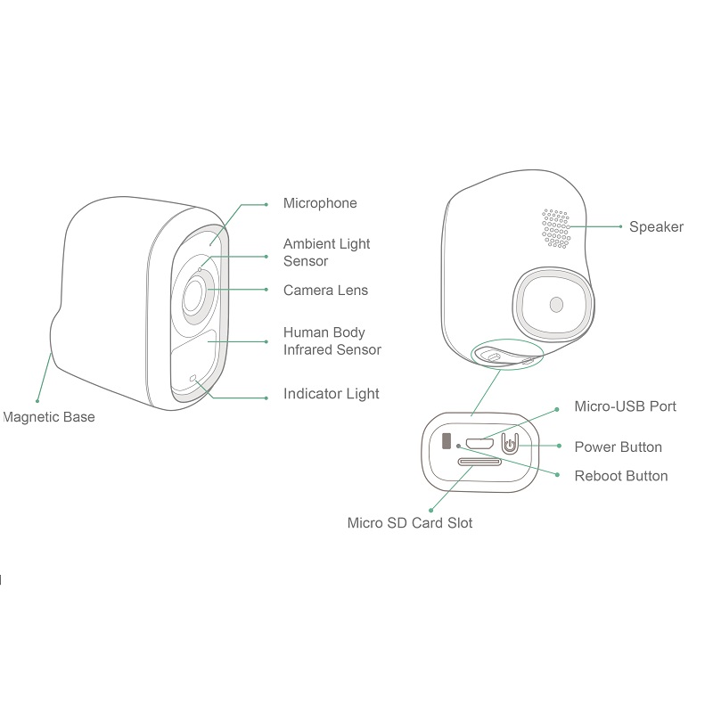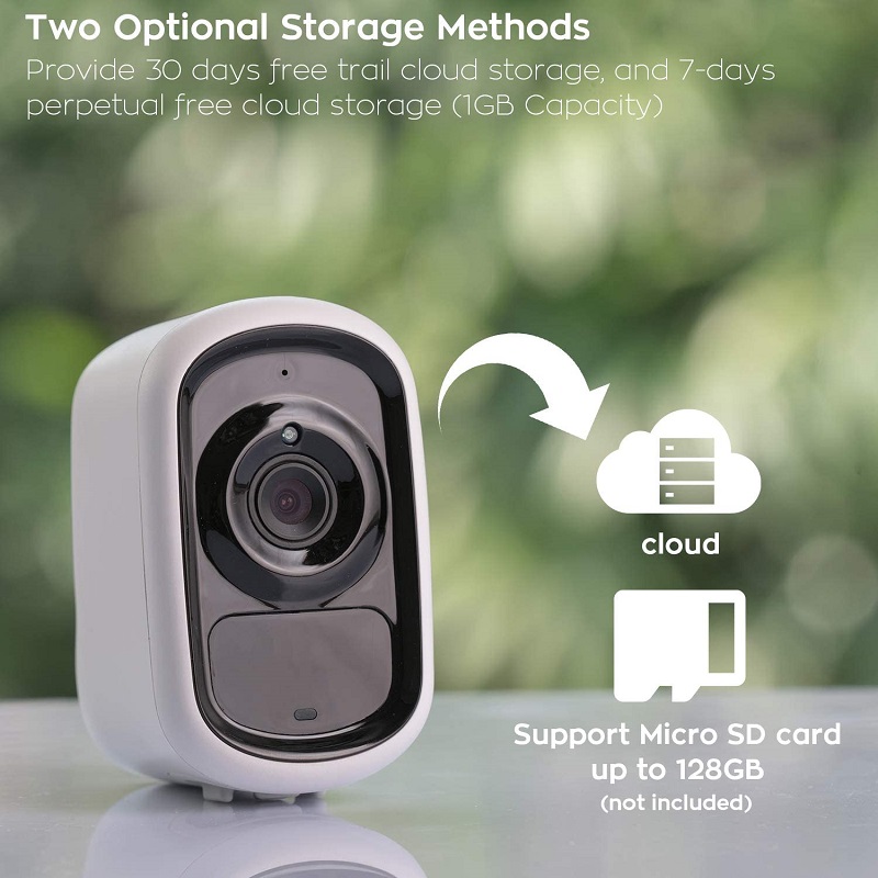 Specification:Sensor:1/3” COMS 2MP image sensorResolution:1920*1080Lens:3.6mmIR LED:8pcsNight vision:10m/33ftSpeaker:Built-inMicrophone:Built-inVideo compression:H.264+Storage:Cloud storage&SD card storage(MAX 128GB,SD card option include)WIFI:2.4GHz only,No support 5GPower:polymer rechargeable battery 5200mahWaterproof:IP66Working temperature:-10℃~55℃