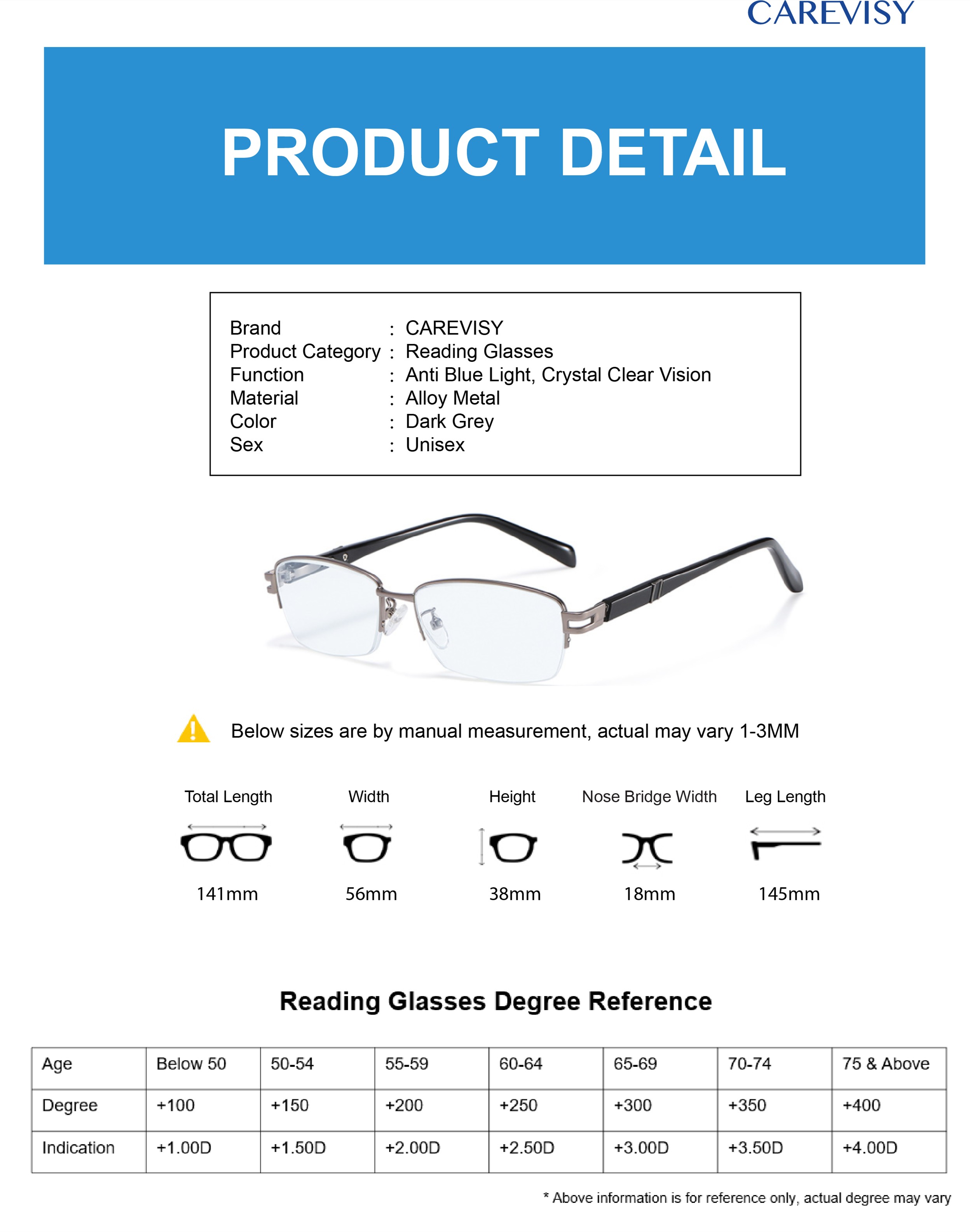 Welcome to CAREVISY, a professional Eyewear brand. We provide high quality Reading Glasses, Computer Glasses, Sunglasses and other Eyewear Accessories at affordable prices based in Singapore. Customer's satisfaction is our top priority. We valued customer's time and we will post out your order by next day. Afterwards, logistic team will pick up your parcel and delivery it to you, expected delivery time by logistic team is about 1-2 working days. Feel free to contact us if you have any queries. Care for your vision and enjoy your shopping now!