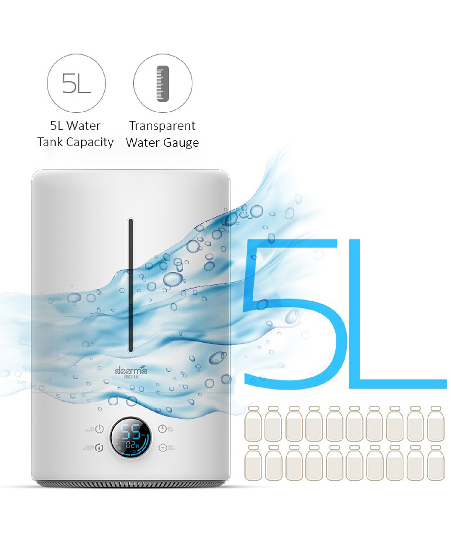 Deerma F628S Smart Humidifier 5L UV Lamp Sterilization 3 Gear 12H Timing Touch Display Low Noise, White