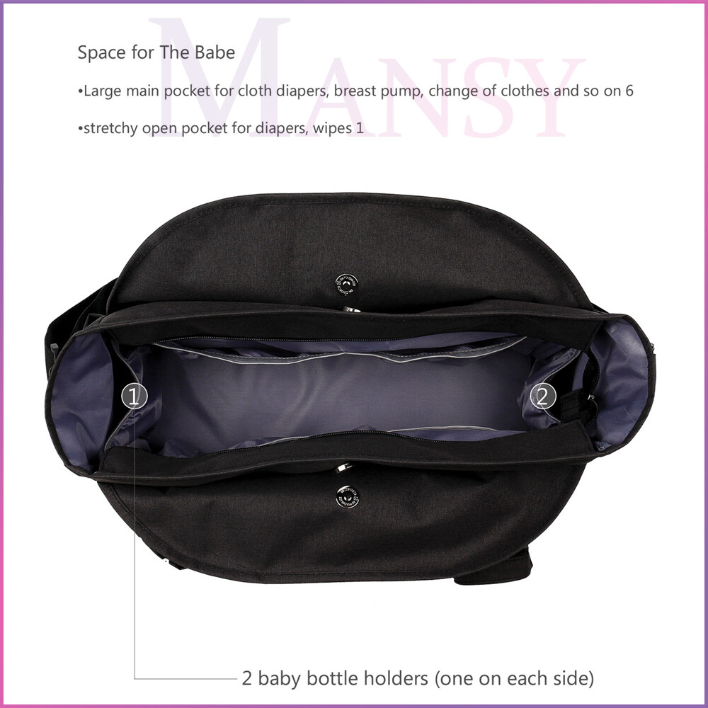 Space for The Babe, Large main pocket for cloth diapers, breast pump, change of clothes and so on 6 stretchy open pocket for diapers, wipes 1, 2 baby bottle holders (one on each side)