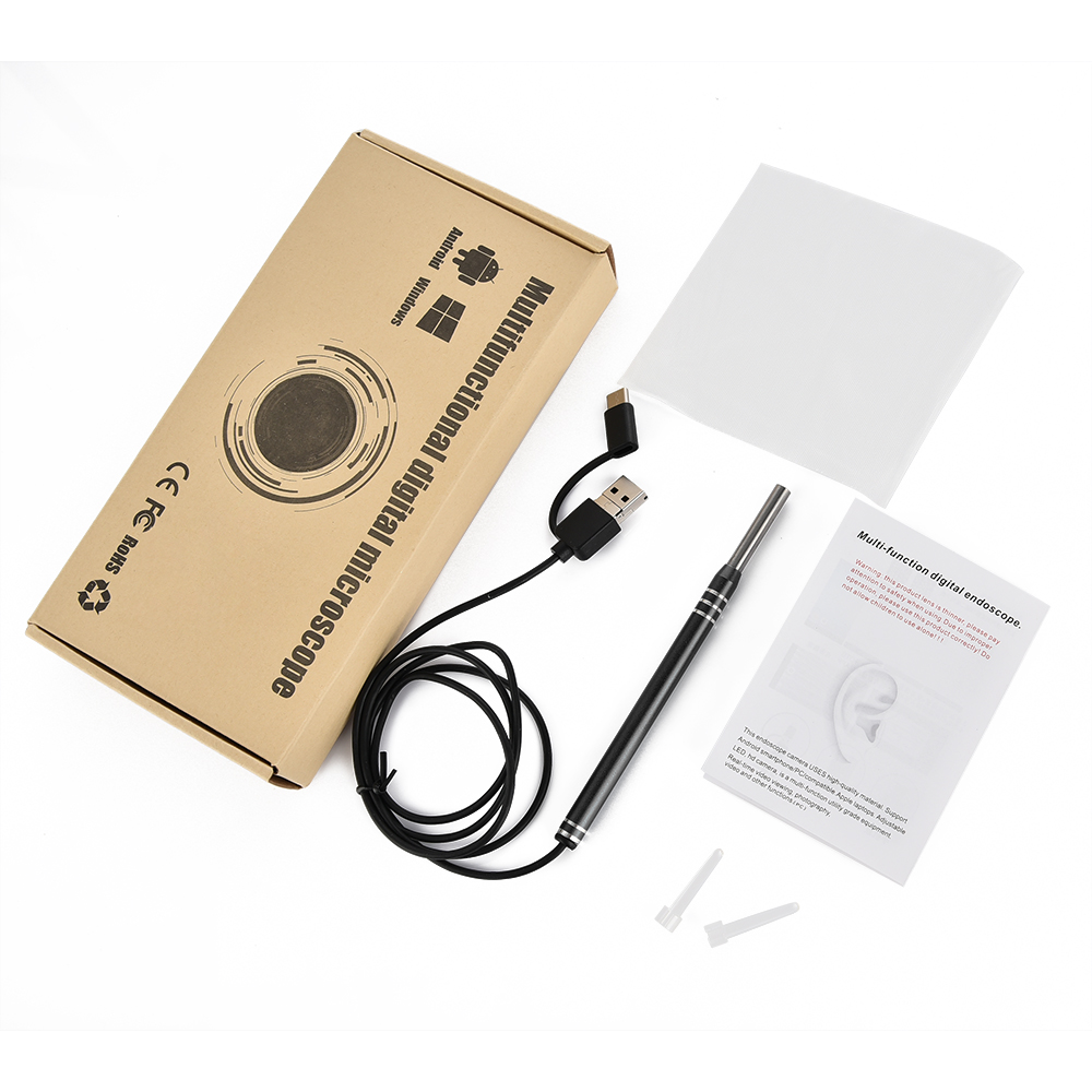 Specifications Material: Metal Shell color: Black / Blue (optional) Camera diameter: 5.5mm Resolution: 1280 * 720/640 * 480 Viewing angle: 70 ° LED Quantity: 6pcs Waterproof rate: IP67 Focus distance: 1.5cm-2cm Cable length: 1m Capture format: JPEG video recording format: AVI Operating system: Type-C, Android, Windows