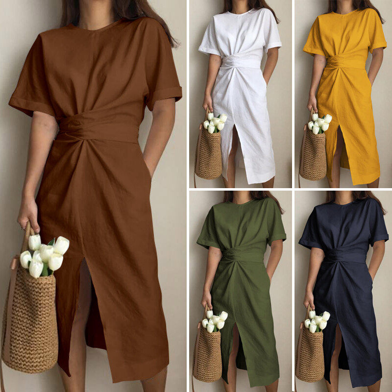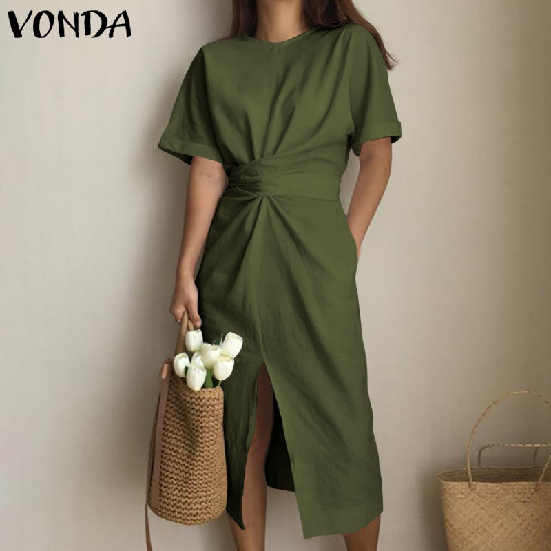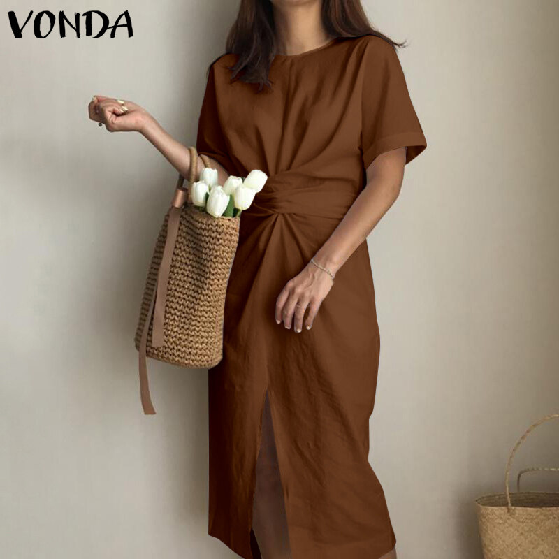 VONDA Women Summer Oversized Short Sleeve Casual Sundress Shirt Slit Dress (Korean Causal)