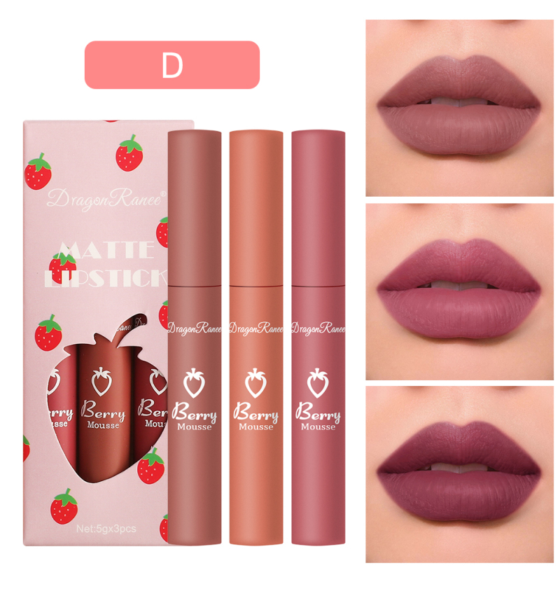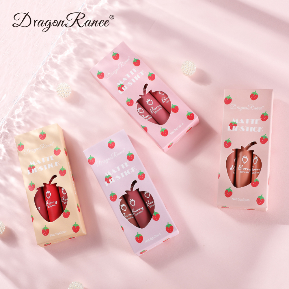 C&M DRAGON RANEE 3pcs Strawberry Lipstick Set Matte Velvet Lip Glaze Set Waterproof Long Lasting Non-fading Non-stick Cup Liquid Lipstick