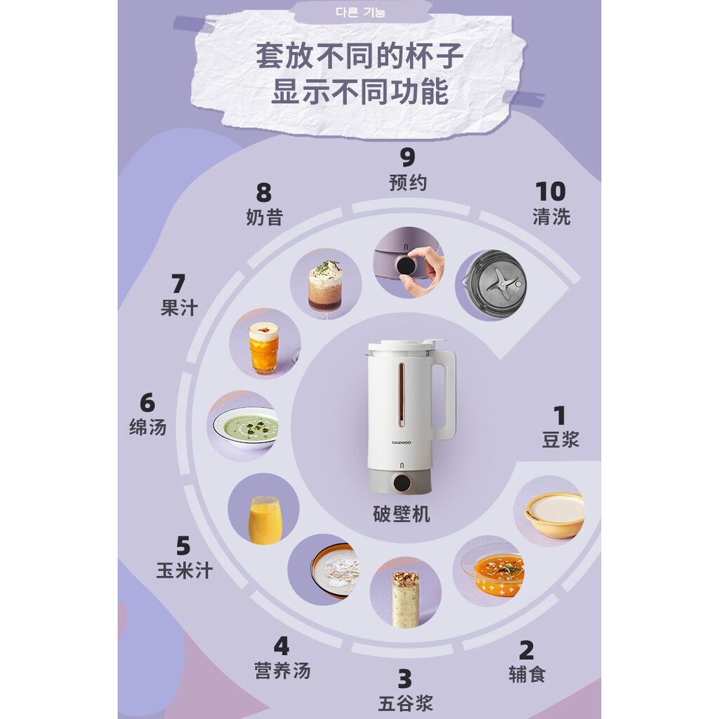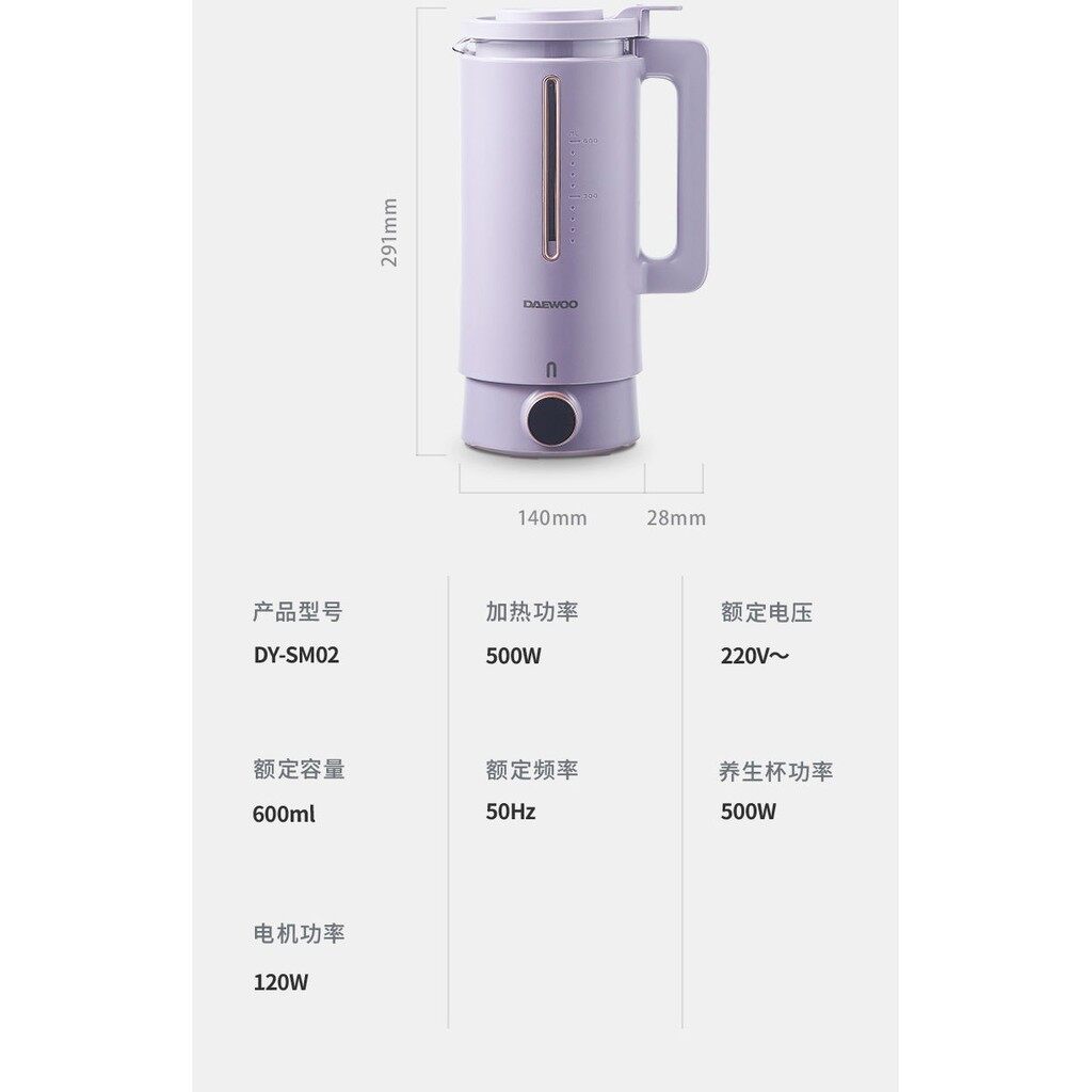 Daewoo大宇 迷你豆浆破壁机&养生壶 20大功能破壁功能:1️⃣豆浆 2️⃣辅食 3️⃣五谷浆 4️⃣营养汤 5️⃣绵粥6️⃣玉米汁 7️⃣果汁 8️⃣ 奶昔 9️⃣ 预约 清洗养生壶功能:1️⃣ 煮沸除氯 2️⃣泡茶 3️⃣奶茶 4️⃣花茶 5️⃣调奶6️⃣养生汤 7️⃣虫草 8️⃣参茶 9️⃣灵芝 保温一般的迷你豆浆机只有5大功能,而大宇破壁机有10个功能,另加养生壶又有另外的10大功能~即是破壁机,又是养生壶,只要你喜欢随时都可以切换~一键搞定煮营养粥给宝宝吃,也可以制作新鲜豆浆,养生米糊也可以~可以当成果汁机,轻松弄出新鲜果汁也可以打出健康奶昔,帮你省下每个月的奶茶钱想要健康养生不是问题,一机在手帮你调理好身子‍️一键清洗,简单方便,简直是懒人的福音提供预约功能,让你睡醒就有早餐喝‍️方便携带,想要带去旅行都不是问题须注意事项:如煮豆浆,不能预先浸泡豆。如需浸泡豆,那么每一次煮,只能浸泡半勺的豆,以避免煮的过程中溢出。为什么选『大宇迷你破壁机』豆浆机?做好豆浆后,不需要过滤渣不需要泡黄豆,而且干豆湿豆 都可以直接放进豆浆机可以12个小时前提早设置时间,不用早起身准备只需25分钟,暖暖的热豆浆就好了小巧轻便且不占位置,设计时尚拥有安全设定。如果盖子没有盖好, 豆浆机会自动切断电源内部采用的是高硼硅玻璃内胆,外面是包覆式外壳,安全防烫按“清洗”键,就自动清洗,省工省时间为了确保产品的质量 和顾客的满意度,每一个产品在寄出之前,我们都会亲自开箱验货,以确保产品的质量!免费 清洁刷 + 量杯 + 说明书 + Malaysia Adapter买豆浆机,我们再免费 送你 清洁刷 + 量杯 +3-pin 插座 (Adapter)产品包装包含主机 + 破壁机+养生杯+电源线(包括插头转换器)+量杯+清洁刷 + 产品说明书豆浆机性能产品尺寸: 16.8cm x 14cm x 29.1cm产品容量:600ml电压:220V加热功率:500W搅拌功率:120W养生杯功率: 500W电机功率:120W电机转速: 20000转/分钟加热方式:底部加热整机净重:1.8KG适用人数:2-3人常见问题1️⃣ 请问需要过滤的吗?答:煮出来的豆浆相当绵密,有一些比较细的渣,可以自行使用比较细密的过滤网过滤几遍。有些人觉得不过滤也行,喜爱有渣的味道。有些觉得不过滤会会觉得豆浆有点粗,甚至味道怪怪。这都看个人口味和选择。过滤完后,味道和外面卖的无差别。也可以自行斟酌加不加糖。(介意勿下单)2️⃣为什么说是免过滤,但还是要过滤?答:免过滤指的并不是完全不过滤(不过滤也能喝),只是煮出来的豆浆还是会有带点比较细少的渣,自行过滤后,即可饮用,味道甚佳。若嫌麻烦过滤的话,倒出豆浆时,上面的会不带渣,底部才会有渣,所以倒出时,可稍微放慢速度倒出,底部的可丢弃不喝。3️⃣煮豆浆时,能不能放糖?答: 请切勿放糖进豆浆机一起煮,这会导致糖焦并使豆浆机内部黏着烧焦的糖。请在煮好后才再加糖。️ 若个人操作问题导致机器故障,恕本店一概不负责。4️⃣请问干黄豆和湿黄豆的区别?答:干黄豆指的是没浸泡过的豆;湿黄豆则是浸泡过的豆。5️⃣:请问豆需不需要浸泡?答:不需要浸泡哦。如果需要浸泡,那么每一次煮,只能浸泡半勺的豆,以避免煮的过程中溢出。6️⃣:黄豆和水需要放多少比例?答:煮豆浆时,豆量和水量豆不能过多或过少,这会导致豆浆溢出或者机器无法开始进行操作。7️⃣:这豆浆机有多少容量(Liter)?答:每次可以做大约300-600ml豆浆。8️⃣:什么是 【一键清洗】功能?答:其中一个功能键是 “清洗”。很简单,倒水进去,挤一些洗碗液下去,按一下 “清洗键“ ,豆浆机内的 4叶立体刀 每分钟 旋转 27200次搅拌清水,帮你缩短清洗时间,省工省时间。️:【一键清洗】功能洗得干净吗?底部刀片和旁边会黏着食物吗?答:【一键清洗】可以帮你 缩短清洗时间,省工省时间。(个人经验) 但是,食物有时还是会黏在旁边/底部,就用 附送的清洗刷子去擦。刀片上擦不干净我就放一块白布下去,用筷子推,就干净了。️: 豆浆机操作时会很吵吗?噪音大吗?答:这款豆浆机操作时的噪音比传统的搅果汁机更小声,可是还是有声音的。大约75分贝。平时30-40dB是较为理想的安静环境;70dB会干扰谈话,传统搅、榨汁机是 89-105分贝之间。这款是75分贝。️: 豆浆机可以煮苹果、马铃薯浓汤 或者宝宝食物吗?需要另外再蒸才放进去豆浆机吗?答: 可以没问题,可以煮苹果、马铃薯浓汤 或者宝宝食物。 不需要另外再蒸, 直接放下去就行了。有任何问题,可以随时联络我们哦~