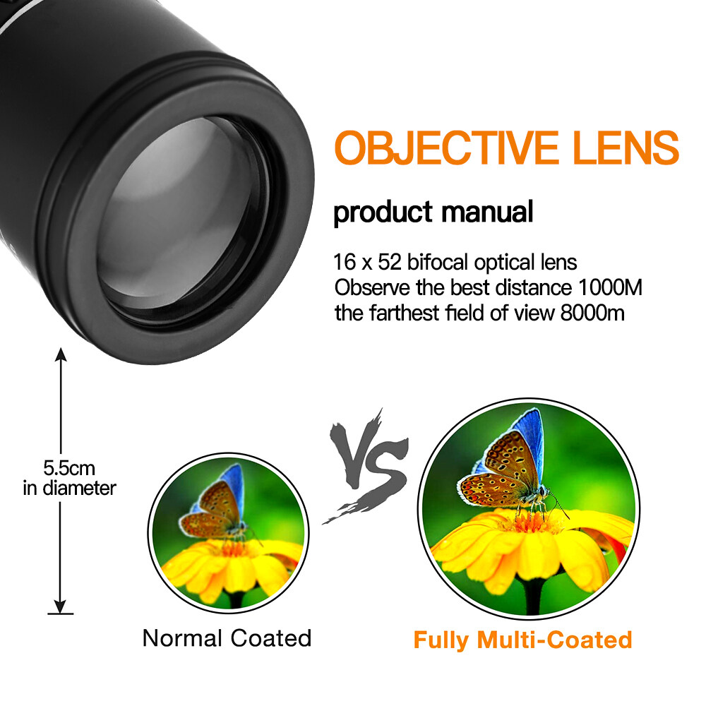 - This monocular offers a 16x magnification and a 52mm objective diameter.